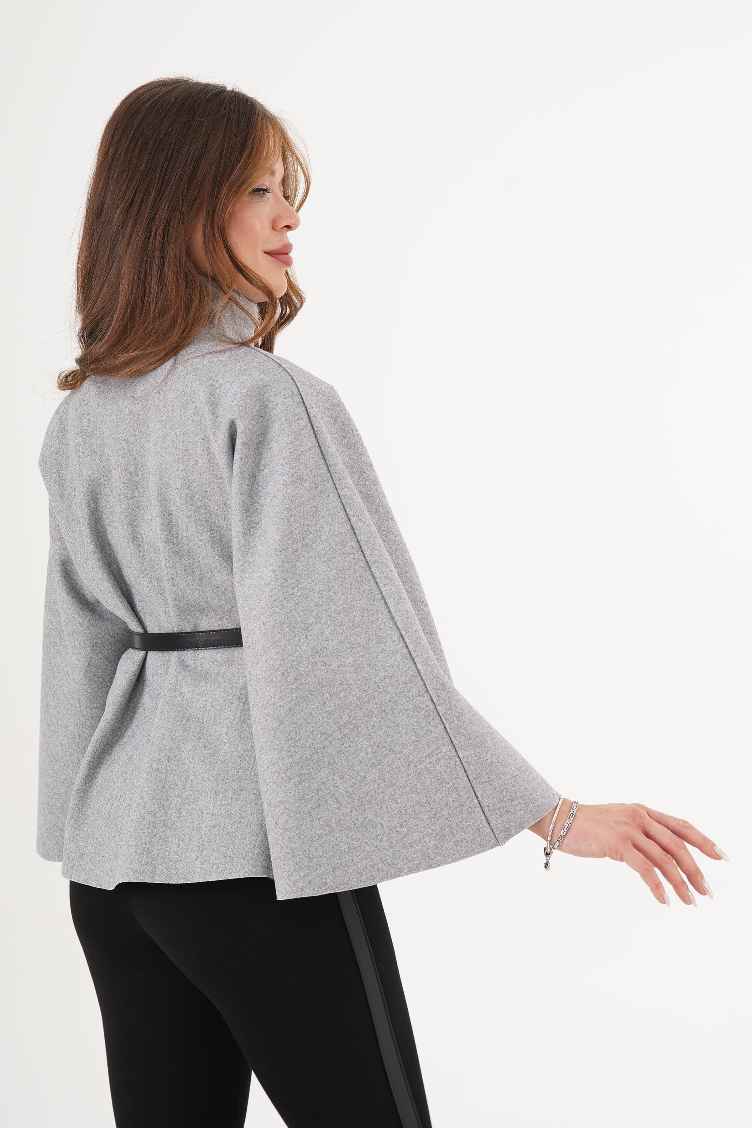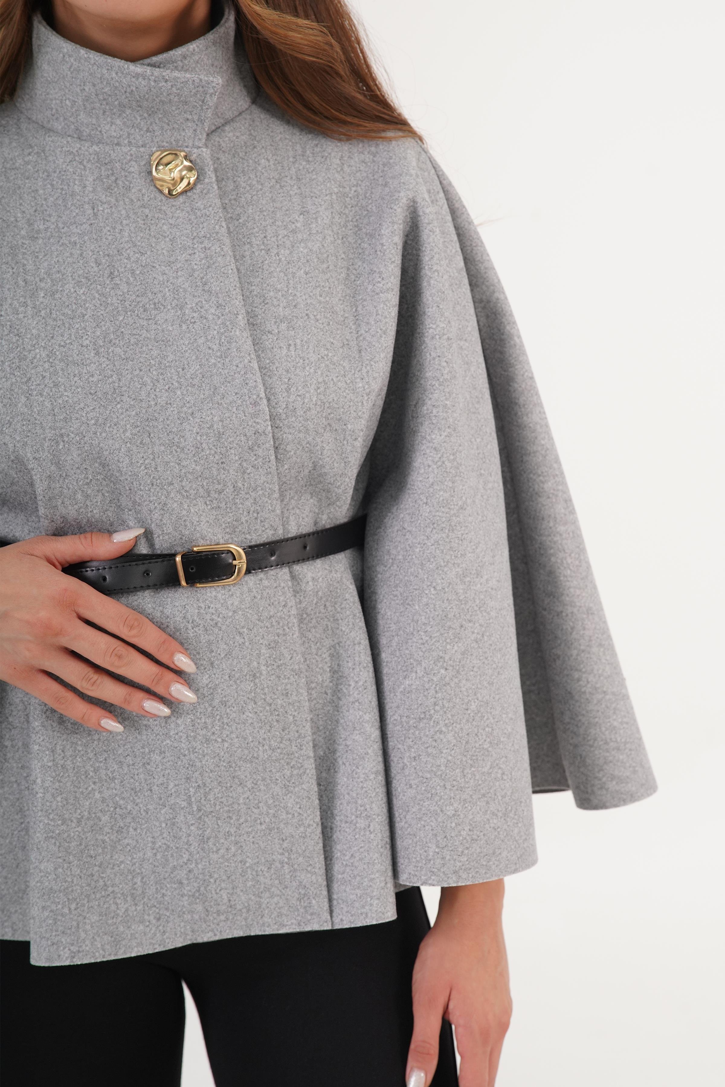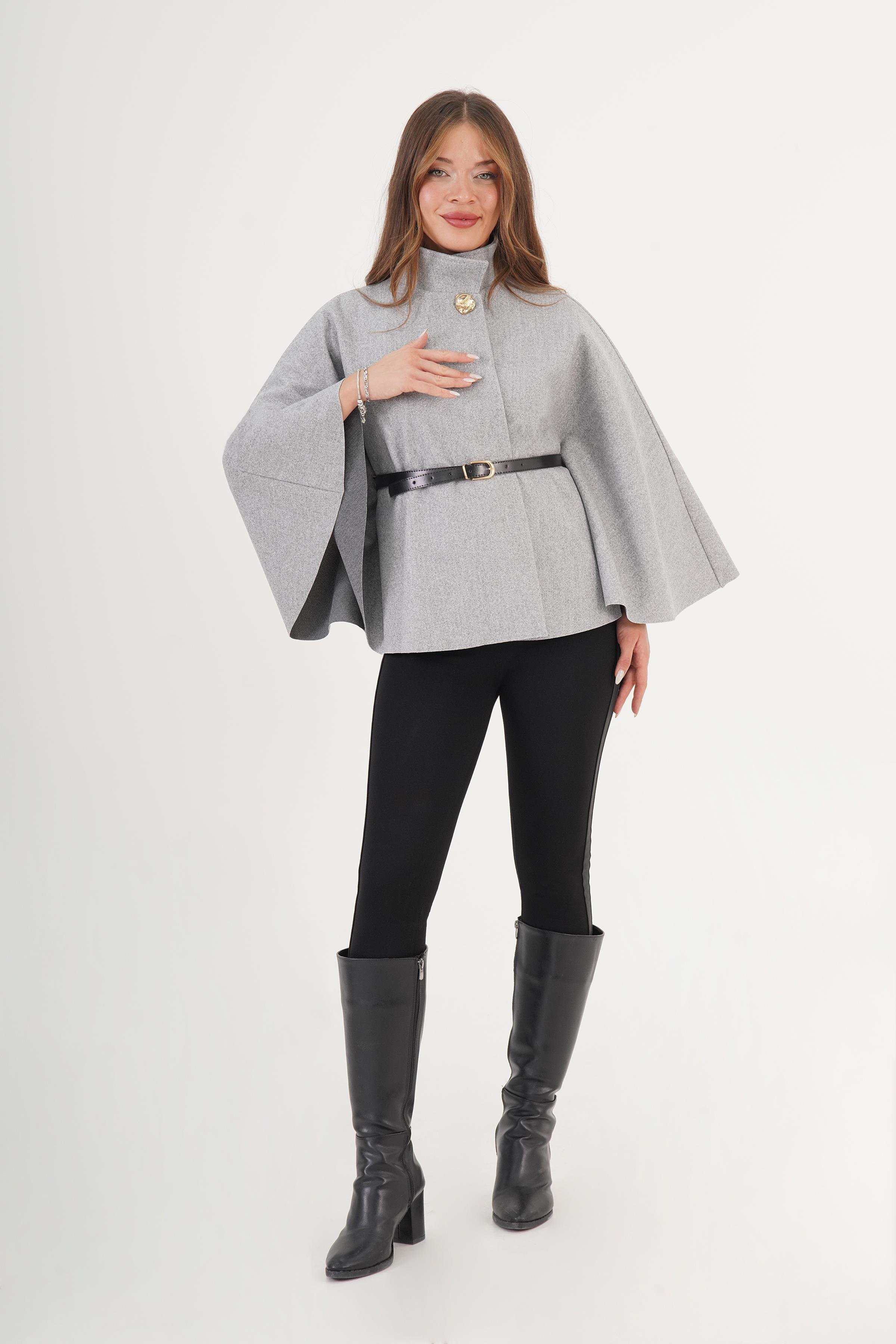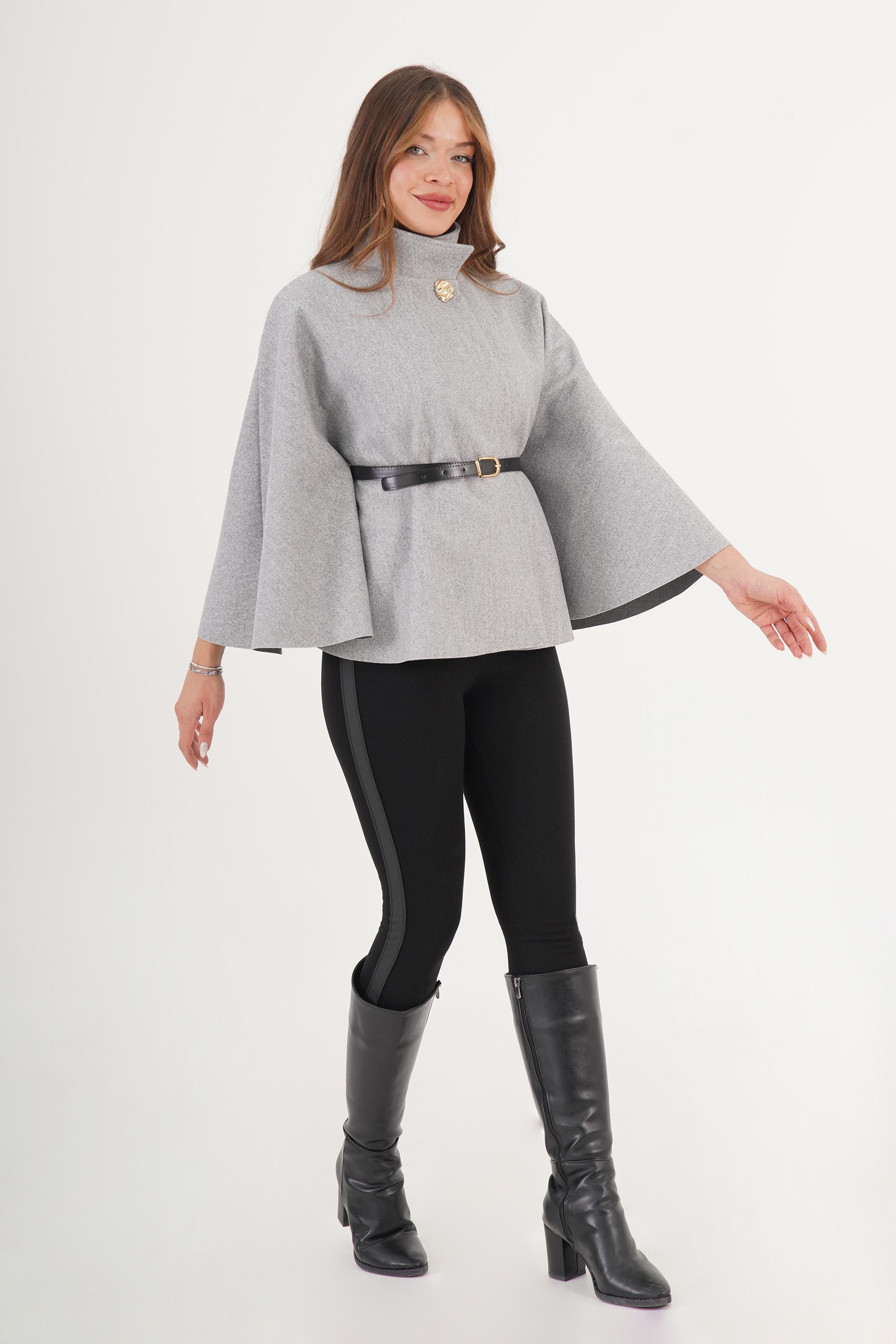 Yumuşak dokusu ve kaliteli kumaşıyla gün boyu konfor sağlayan bu panço, hem şehir hayatında hem de özel davetlerde rahatlıkla tercih edilebilir. Gri rengiyle zamansız bir şıklık sunan model, sezonun en çok tercih edilen dış giyim parçalarından biridir.